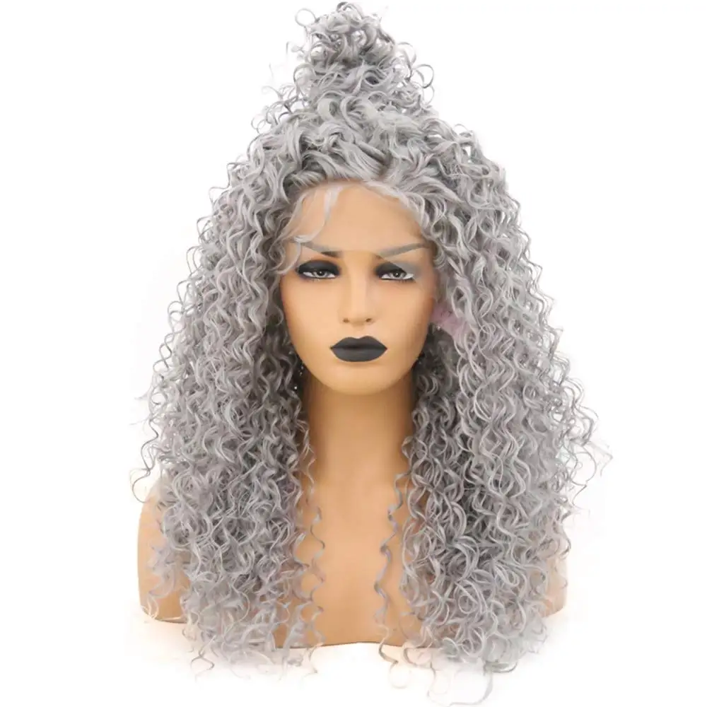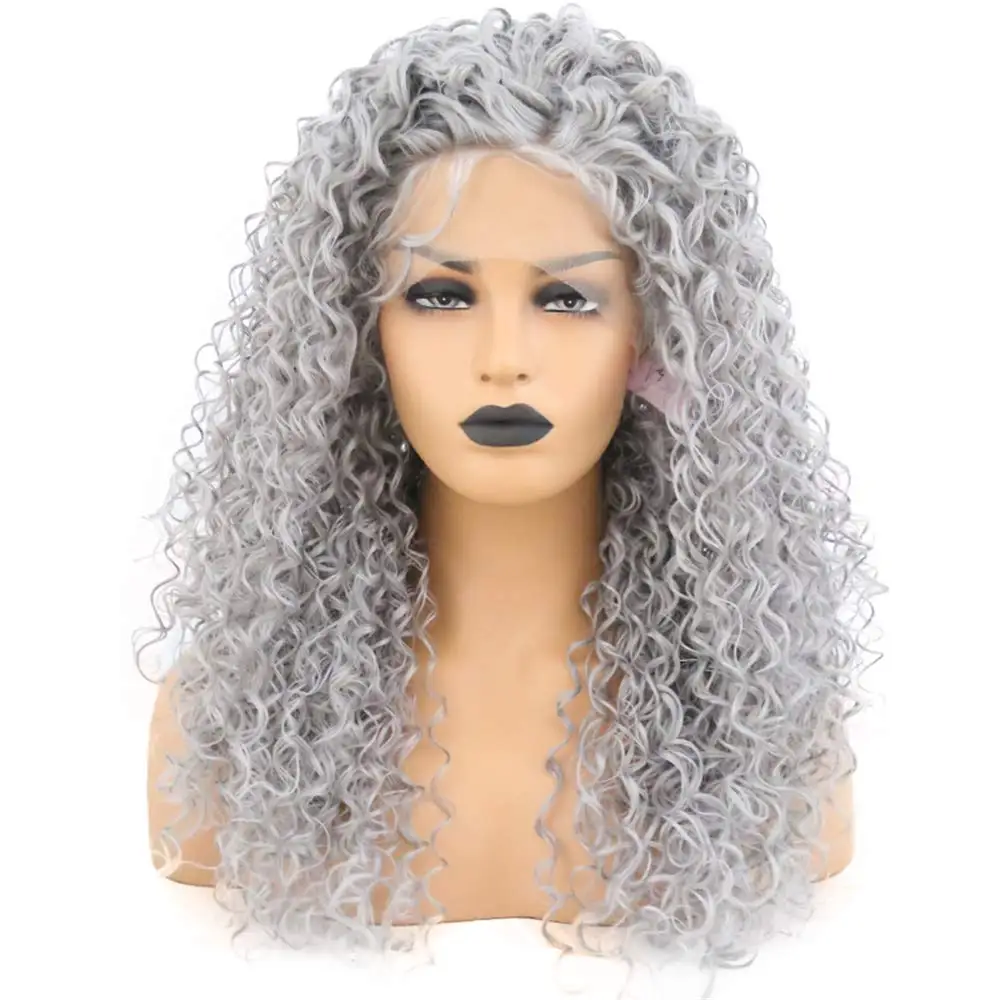 Best Quality RONGDUOYI Gray Hair Heat Resistant Fiber Lace Front Wigs for Women Baby Hair Kinky Curly Long Grey